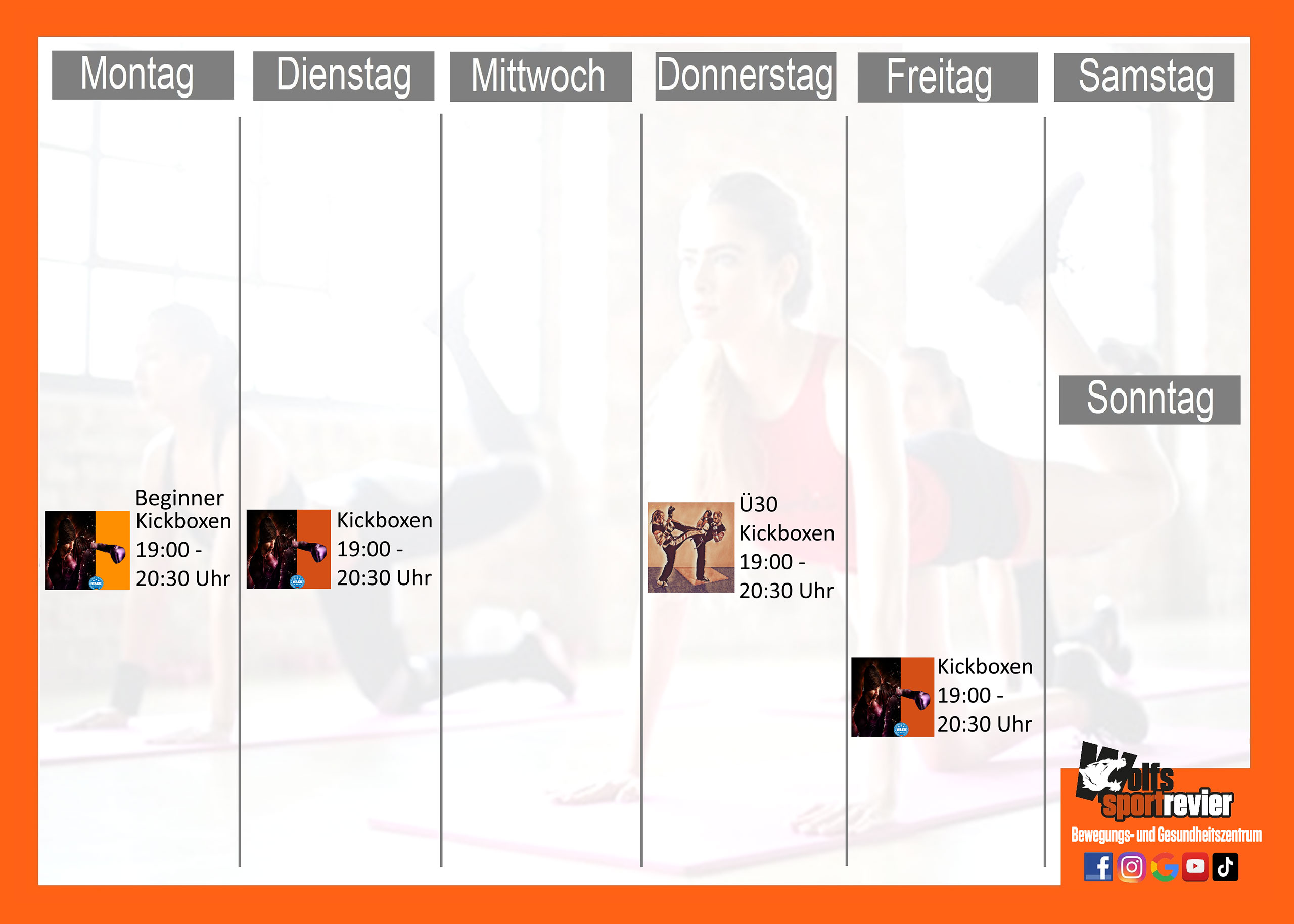 | 19.00 - 19.15 | Kickboxen Budo Kursraum 19.00 20.30 | Kickboxen Budo Kursraum 19.00 20.30 | Kickboxen Ü30