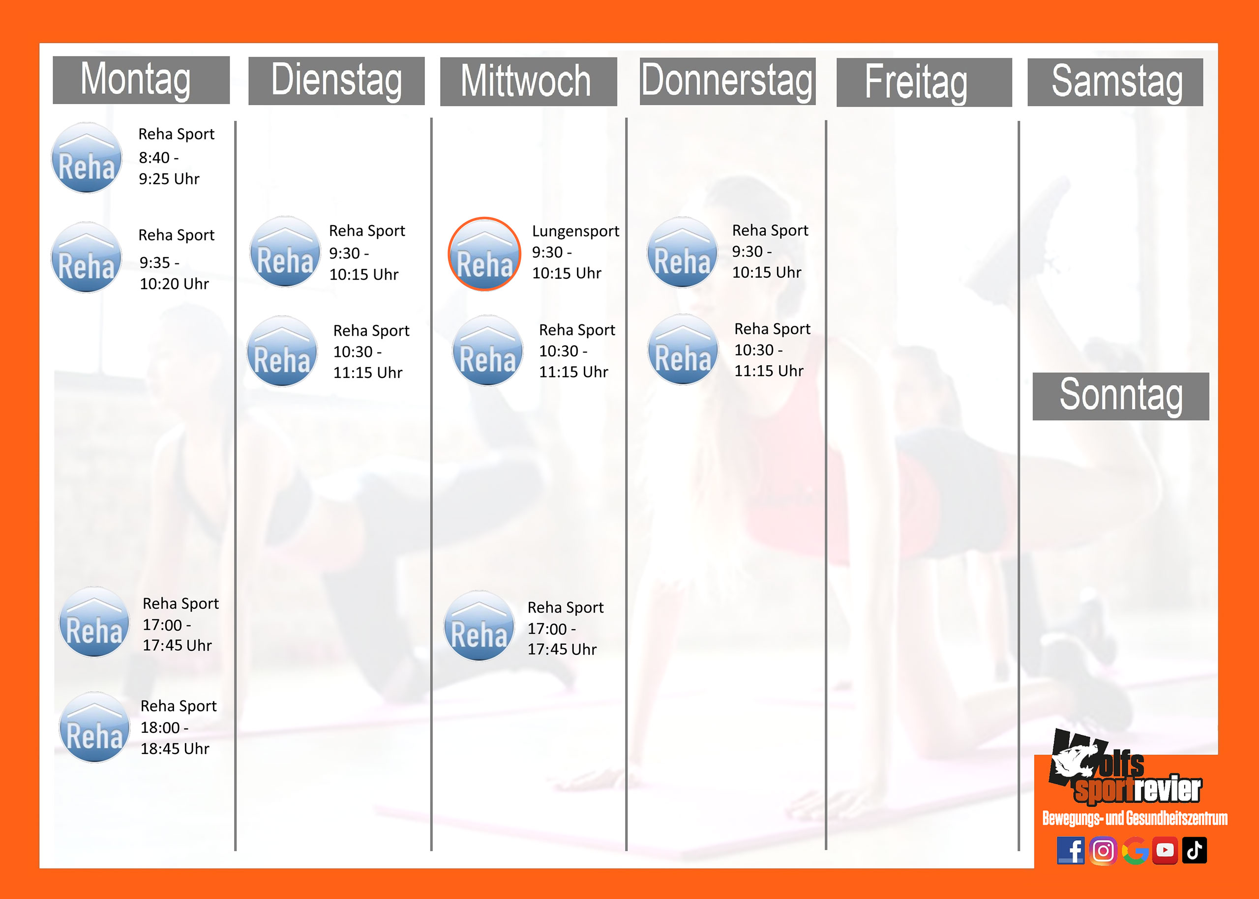 | 09.30 - 09.45 | Reha Sport Reha Kursraum 09.35 10.20 | Reha Sport Reha Kursraum 09.30 10.15 | Reha Sport Reha Kursraum 09.30 10.15 | ||||